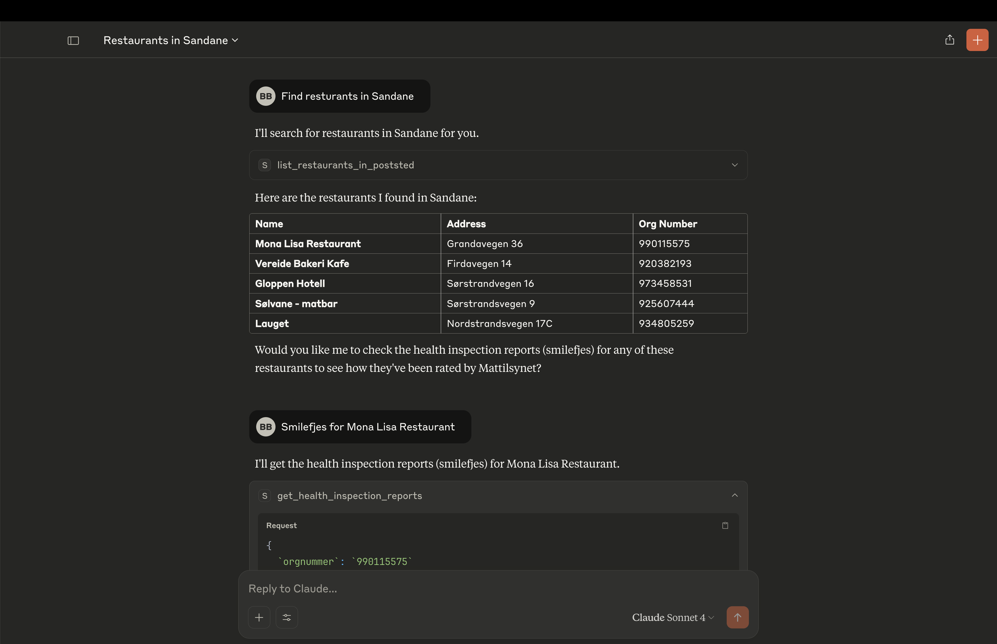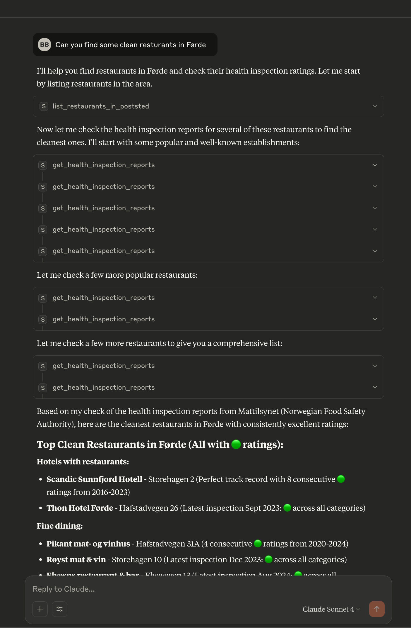 Har satt opp en dedikert MCP-server som gir enkel tilgang til Mattilsynets “smilefjes”-rapporter — altså tilsynsresultatene som viser hvor godt restauranter og kantiner følger kravene til mattrygghet og hygiene. Serveren er optimalisert for LLM-klienter (Claude Desktop, ChatGPT, cursor ++), slik at du kan spørre rett i naturlig språk og få strukturerte svar tilbake.