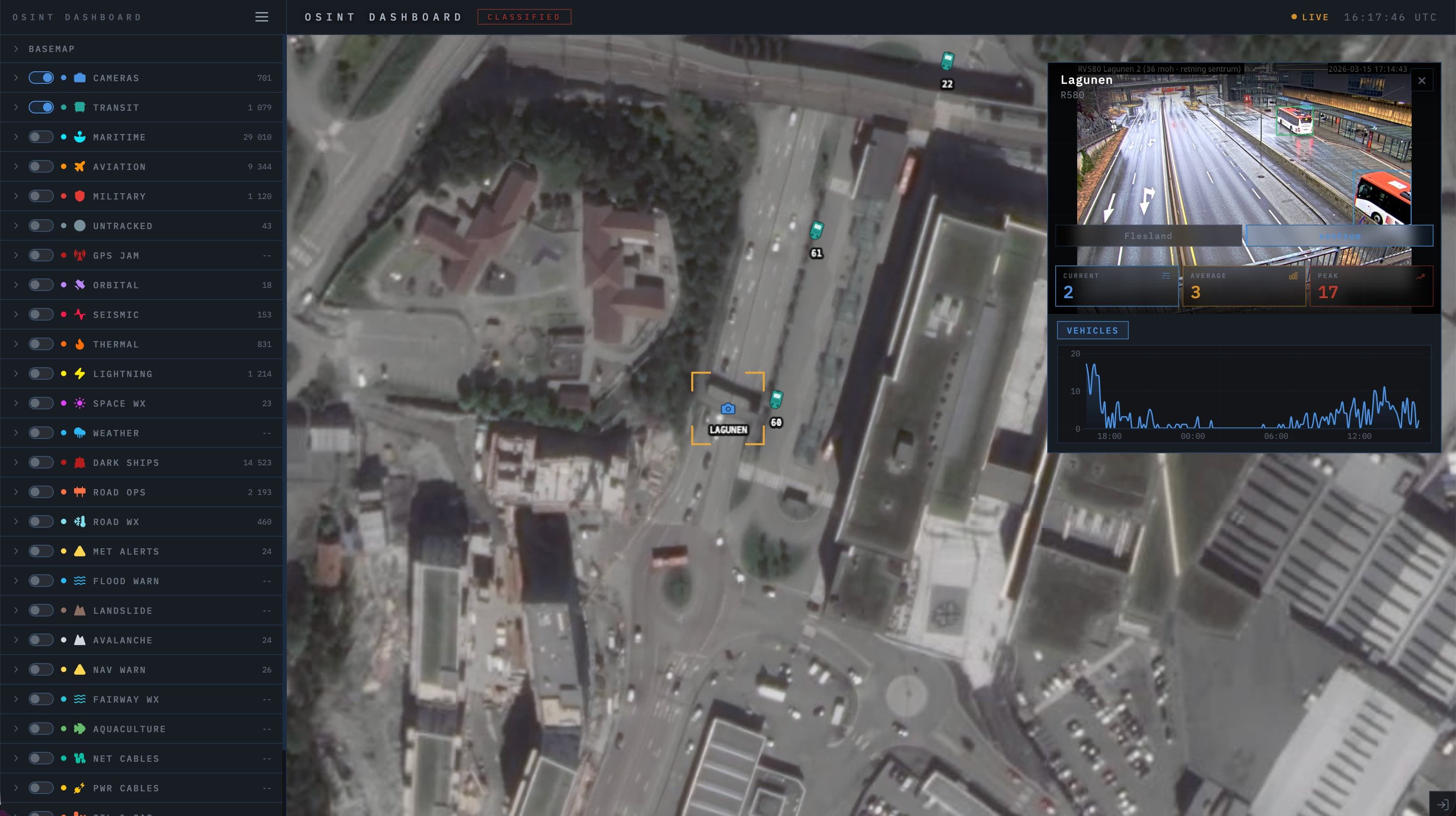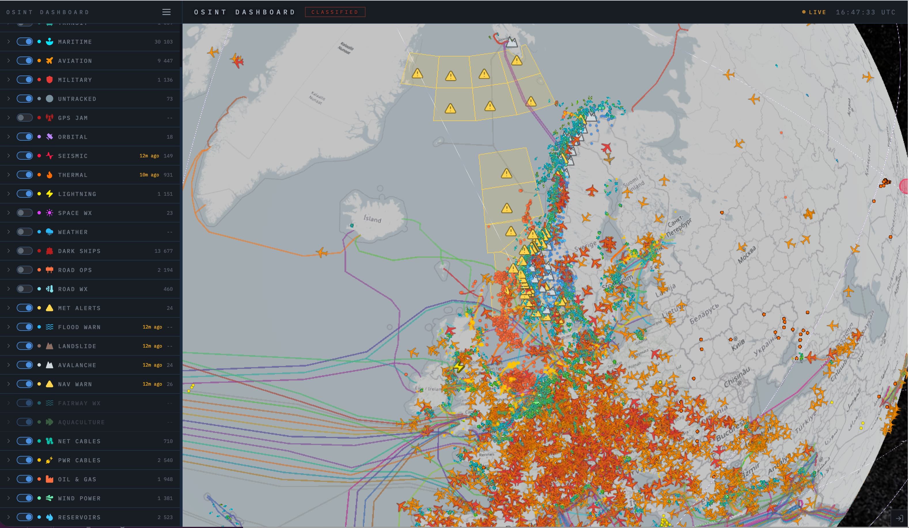 OSINT Dashboard gir deg et levende, interaktivt kartbilde som samler åpne etterretningskilder (Open Source Intelligence) i én felles visning. Dashboardet oppdateres kontinuerlig og lar deg slå av og på over 30 ulike datalag for å bygge det situasjonsbildet du trenger.